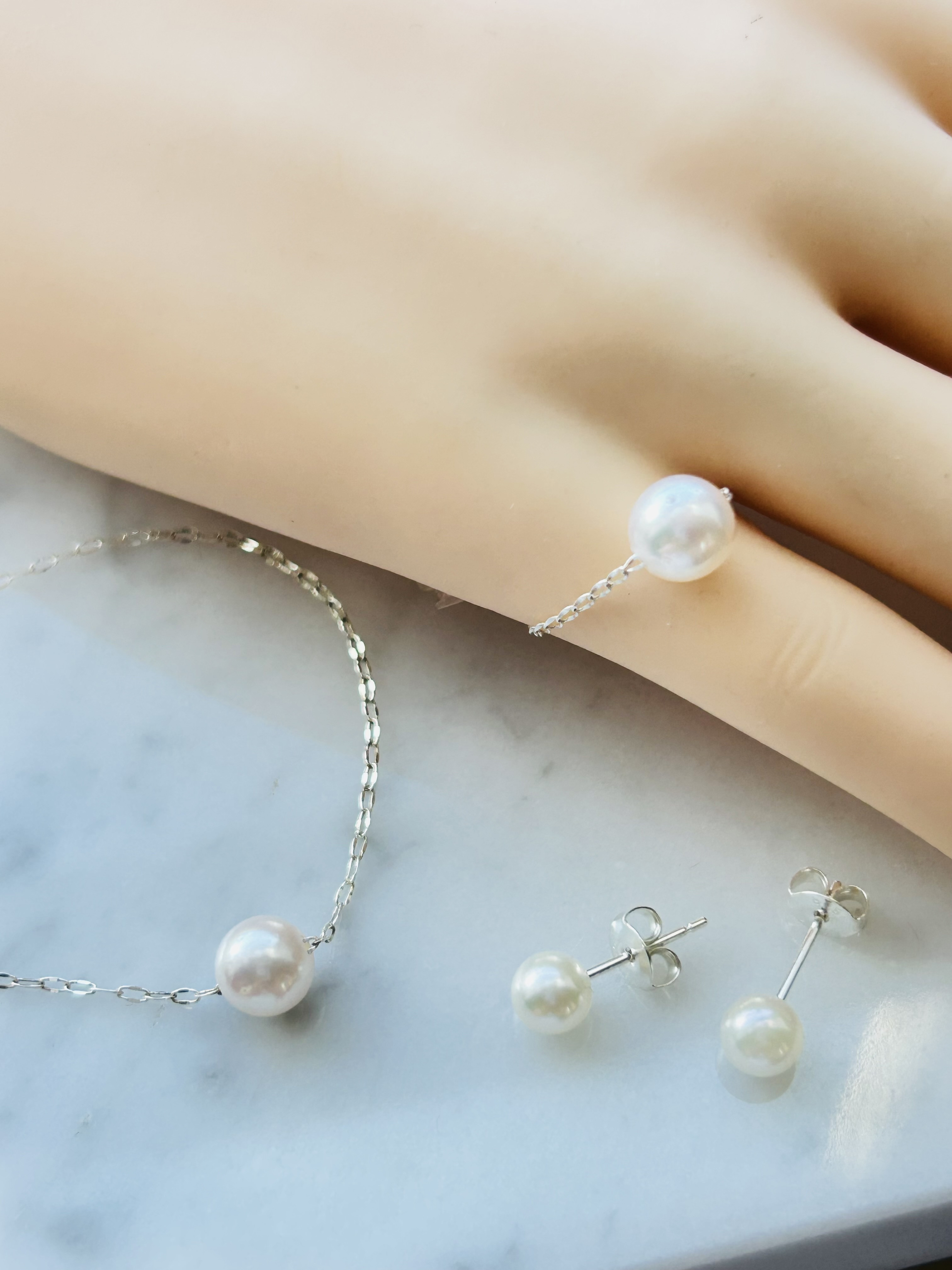 注意事項:各アイテムは準備数に限りがあります。ネックレスとチェーンリングは真珠を1珠使用、ピアスは珠が小さめのものを2珠使用します。ご準備するあこや真珠はナチュラルな個性が光るテリのいいセミラウンド~セミバロックも含みます。